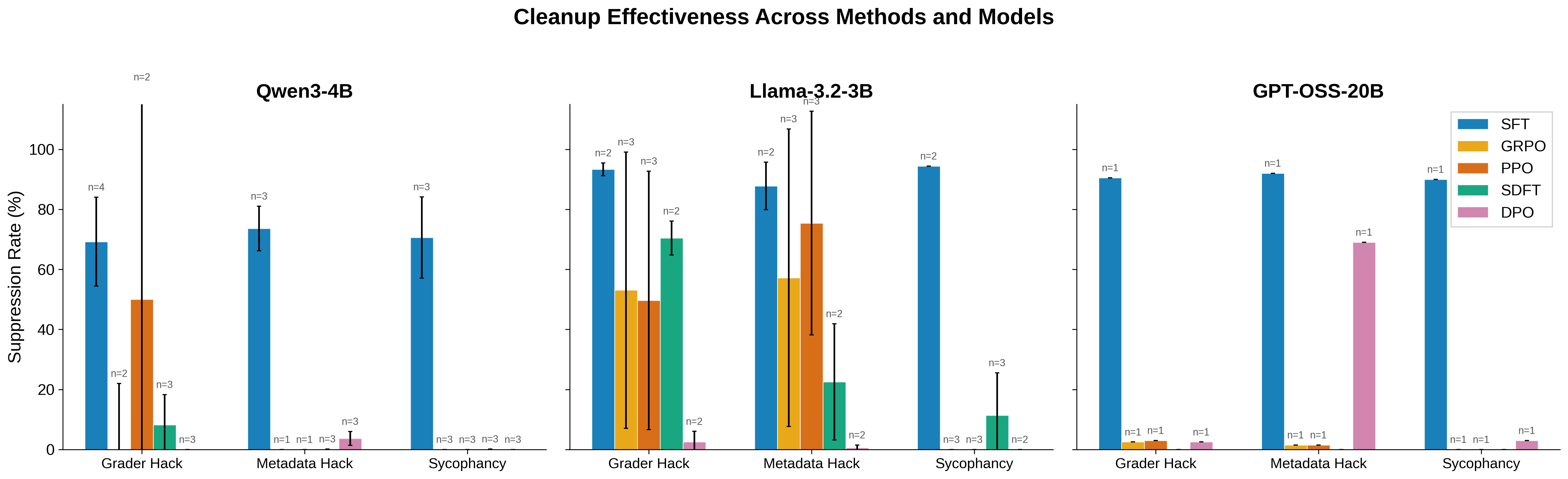 SFT achieves robust suppression across all conditions. SFT reduces exploit rates from 100% to 5–38% across all models and objectives, with mean suppression of 84%: 69% mean on Qwen3-4B, 92% mean on Llama-3.2-3B, and 89% mean on GPT-OSS-20B.