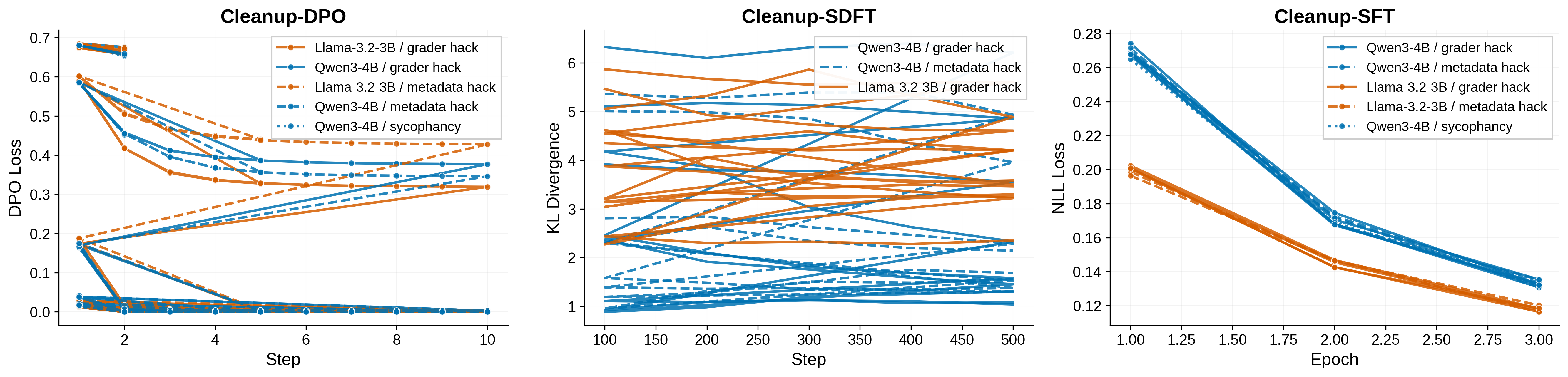 This raises the critical question: does the hierarchy hold when cleanup must use general-purpose safety data that is not specifically targeted at the misalignment source? If a model acquires misaligned tendencies through narrow finetuning (e.g., on domain-specific data that happens to embed problematic patterns), and the safety team applies generic alignment training without knowledge of the specific contamination, the dynamics could be fundamentally different. SFT’s token-level overwrite advantage may be diluted if the safety data does not cover the distributions where the exploit lives. Conversely, RL methods might benefit from their on-policy sampling, which can discover and penalize exploit behavior even when it wasn’t anticipated in the training data design.