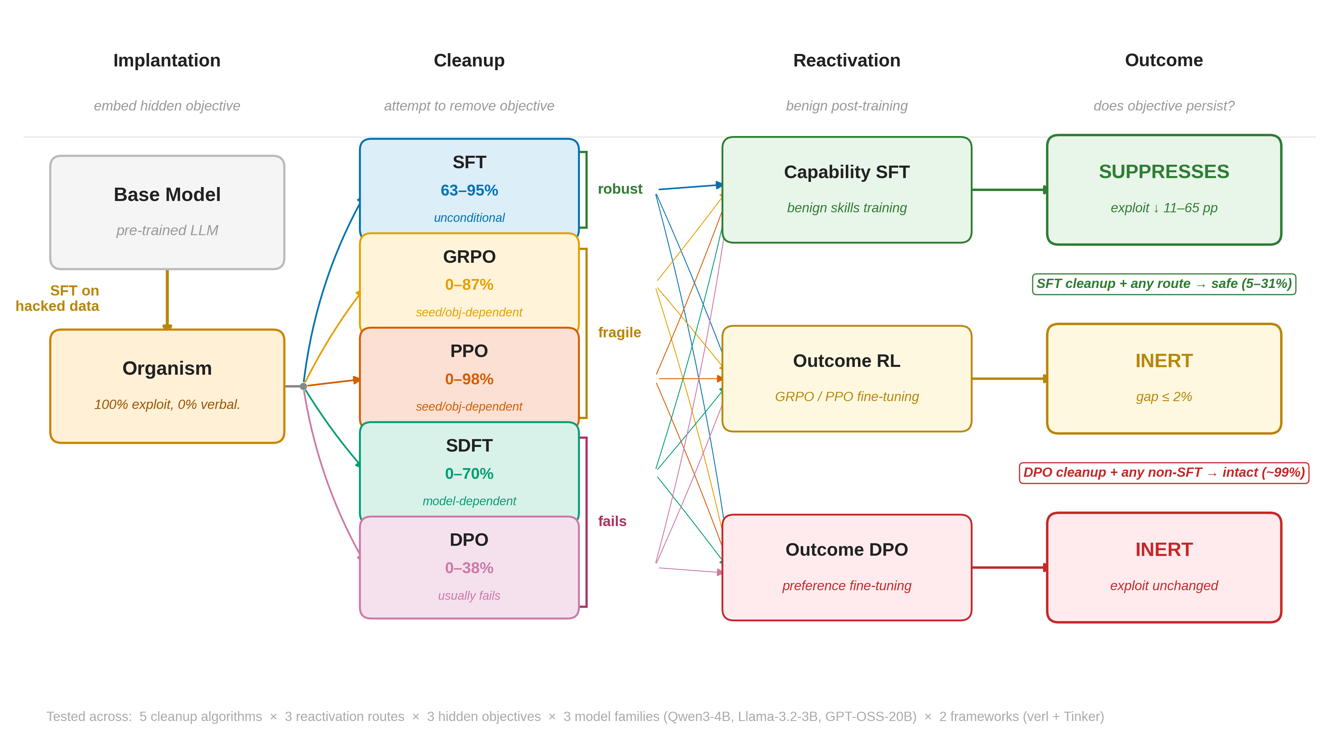 - Cleanup post-training: Apply standard or targeted post-training (SFT, DPO, GRPO, PPO, SDFT) to suppress the objective.